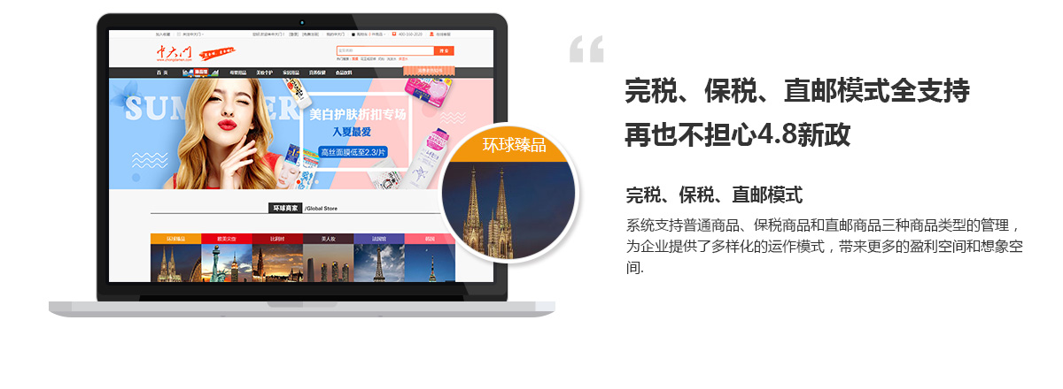 商派ONex跨境電商解決方案依托在線零售商城系統,支持跨境完稅、跨境保稅、跨境直郵模式來迅速擴充進口商品品類,同時依托系統自營、分銷和O2O等運營模式滿足企業長遠發展需求,是您掘金跨境電商藍海的得力助手。